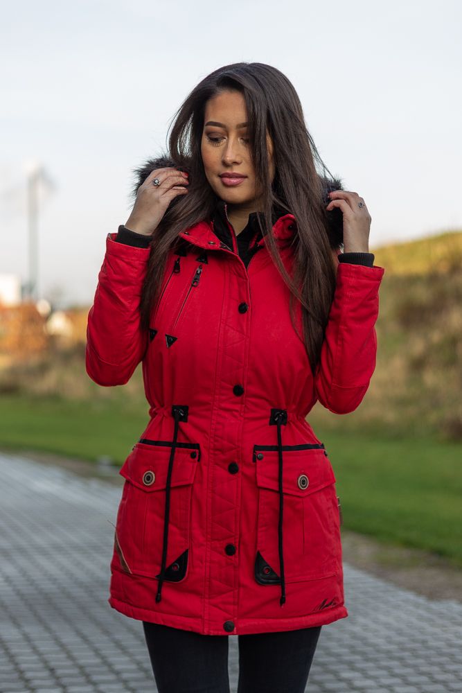 Varm vinter jakke med snøre i taljen og sort faux fur pels krave
