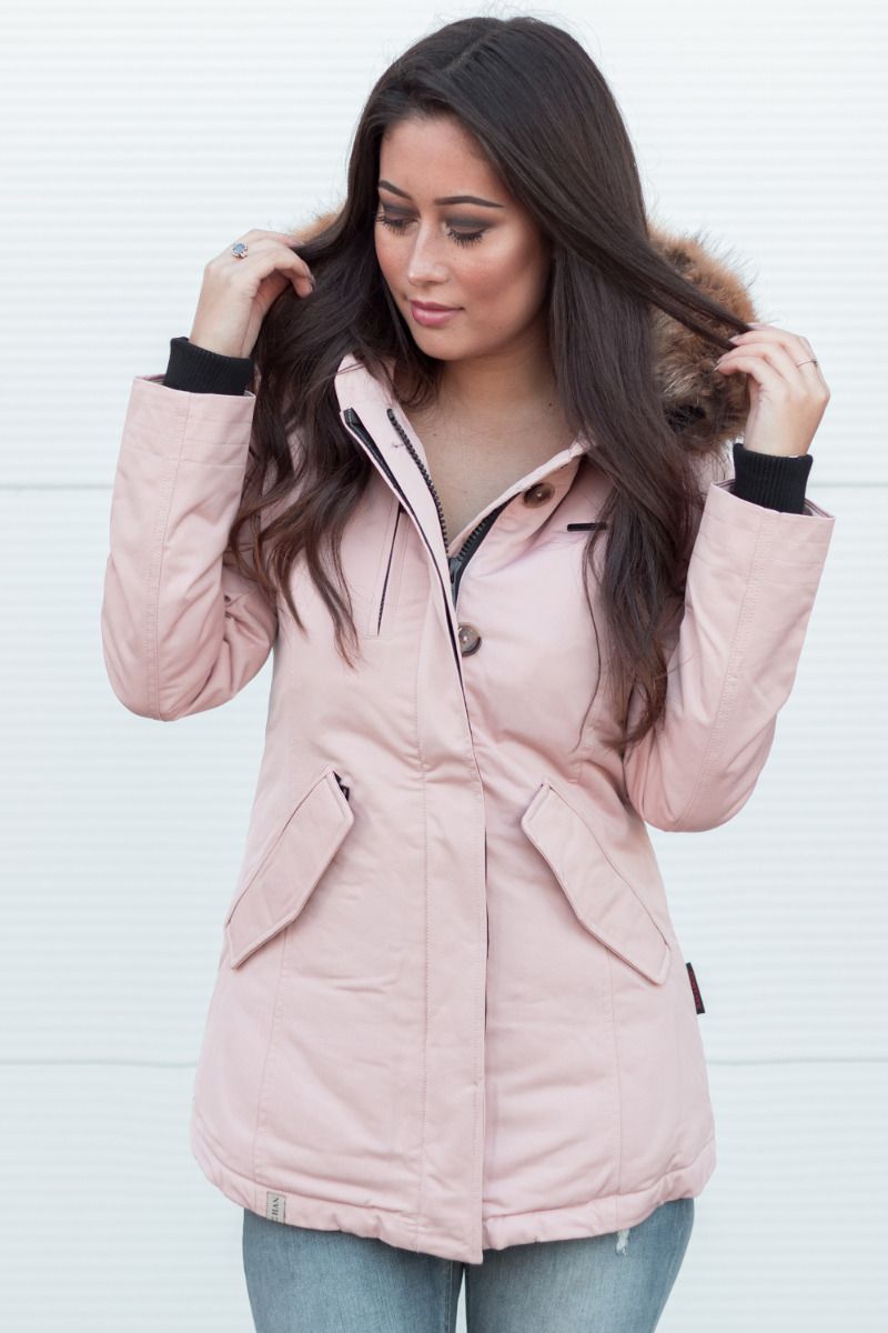 Jakken er vand afvisende og lukkes med lynlås og knapper, pelsen kan tages af.