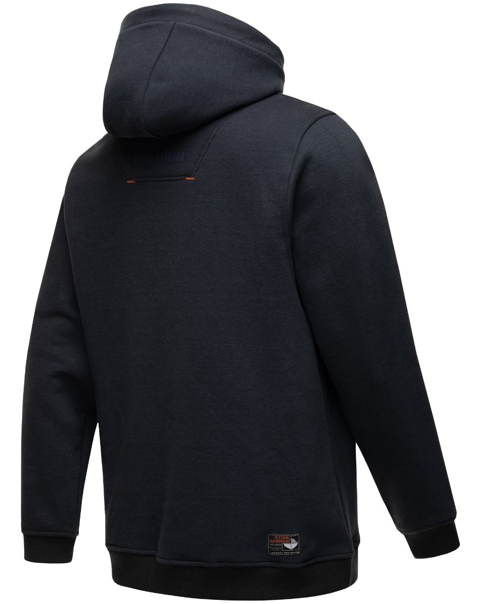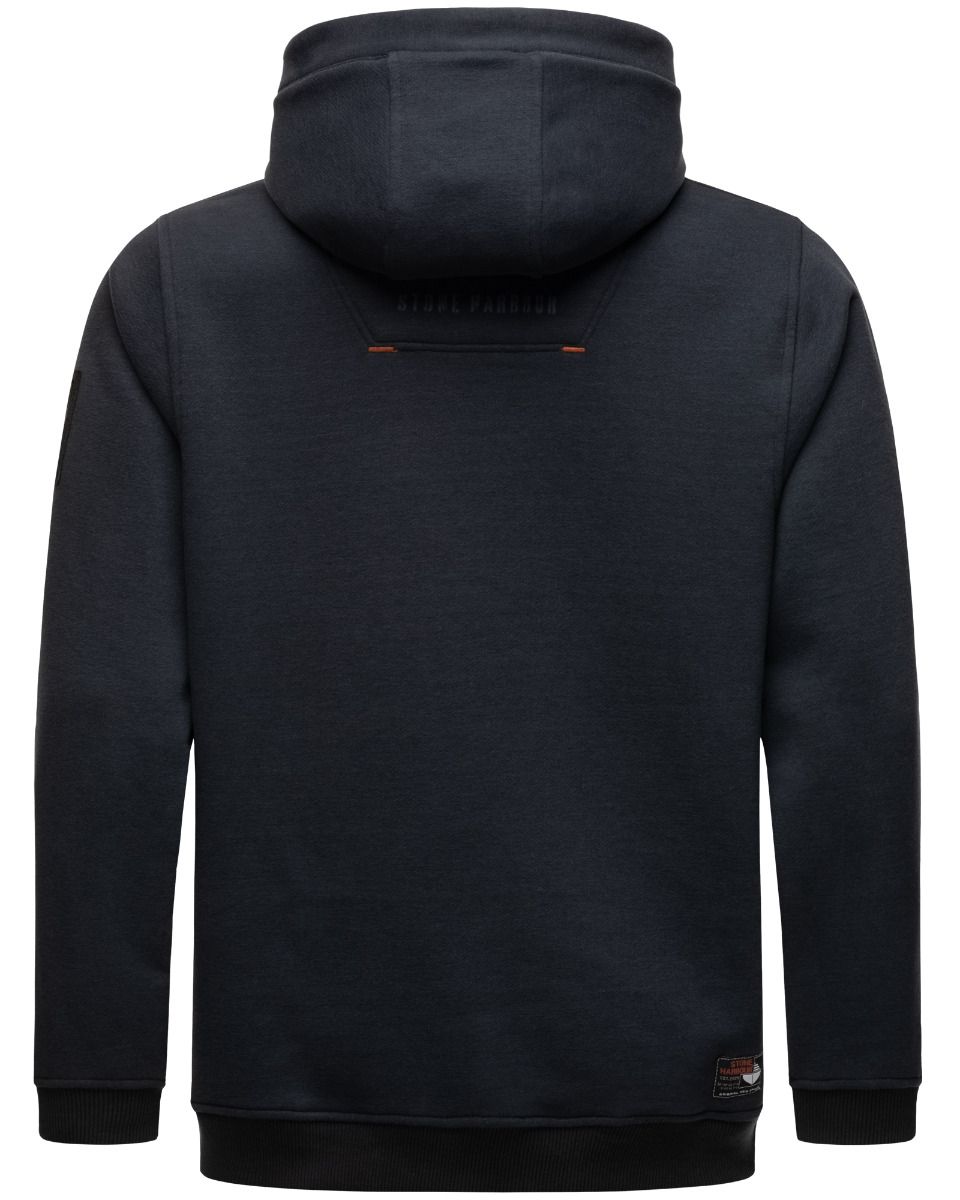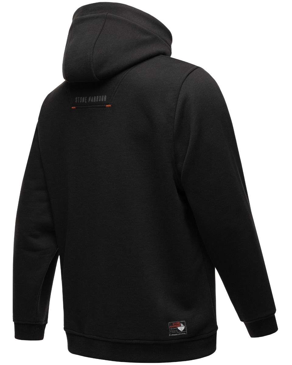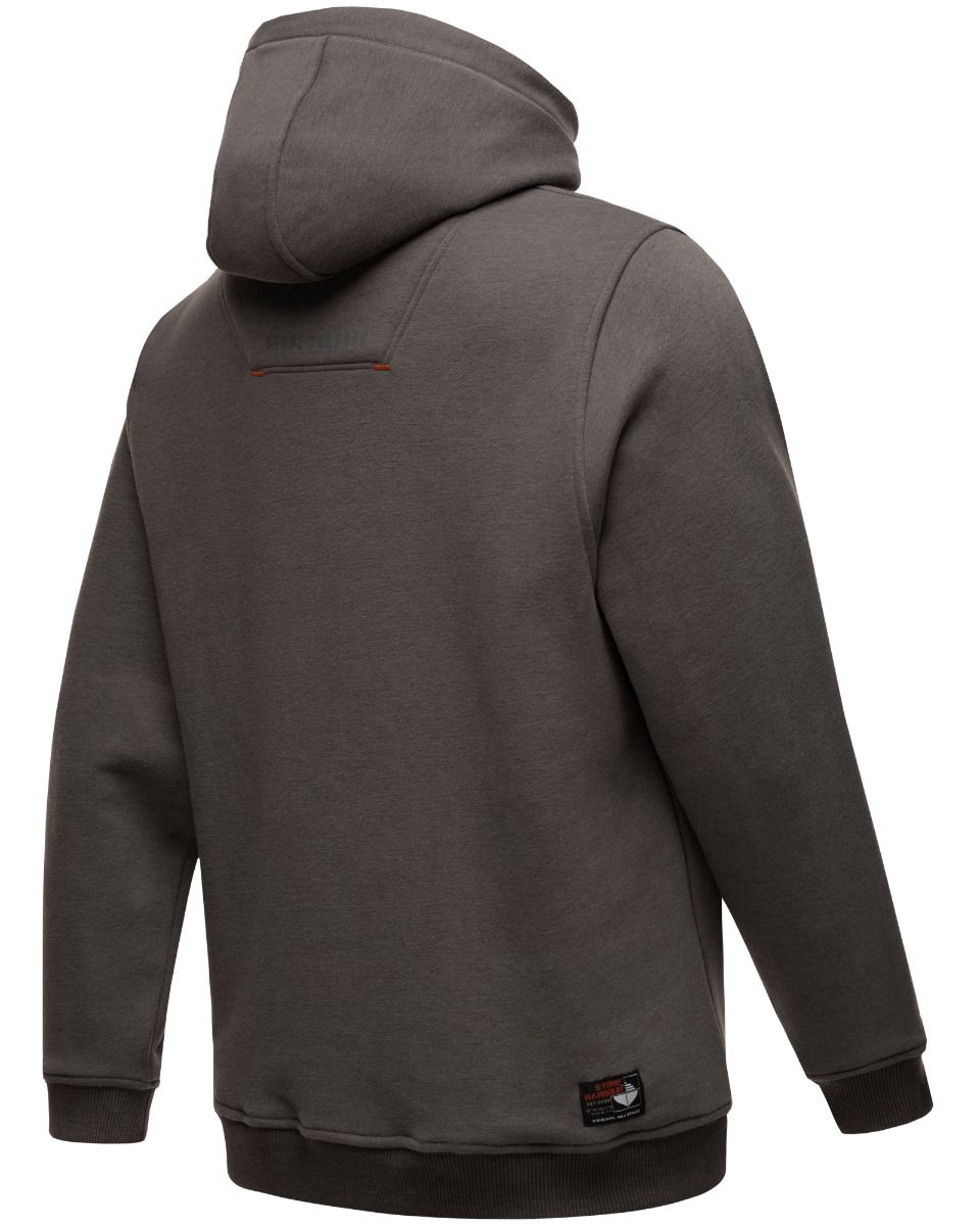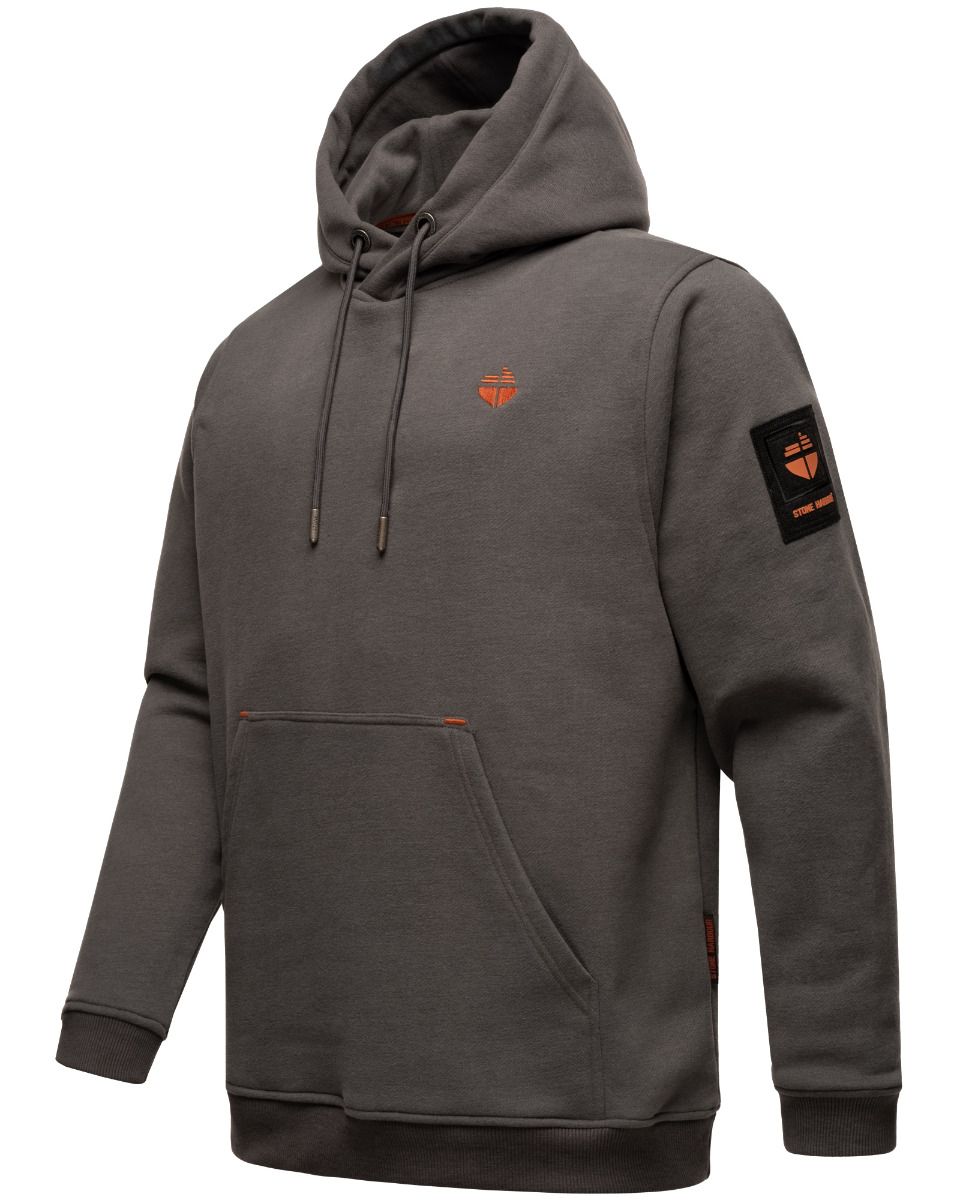 Flot herre sweatshirt med hætte og mange flotte detaljer i klassisk design, og rigtig behagelig at have på, den har rib kanter ved ærmer og for neden, lomme på forsiden