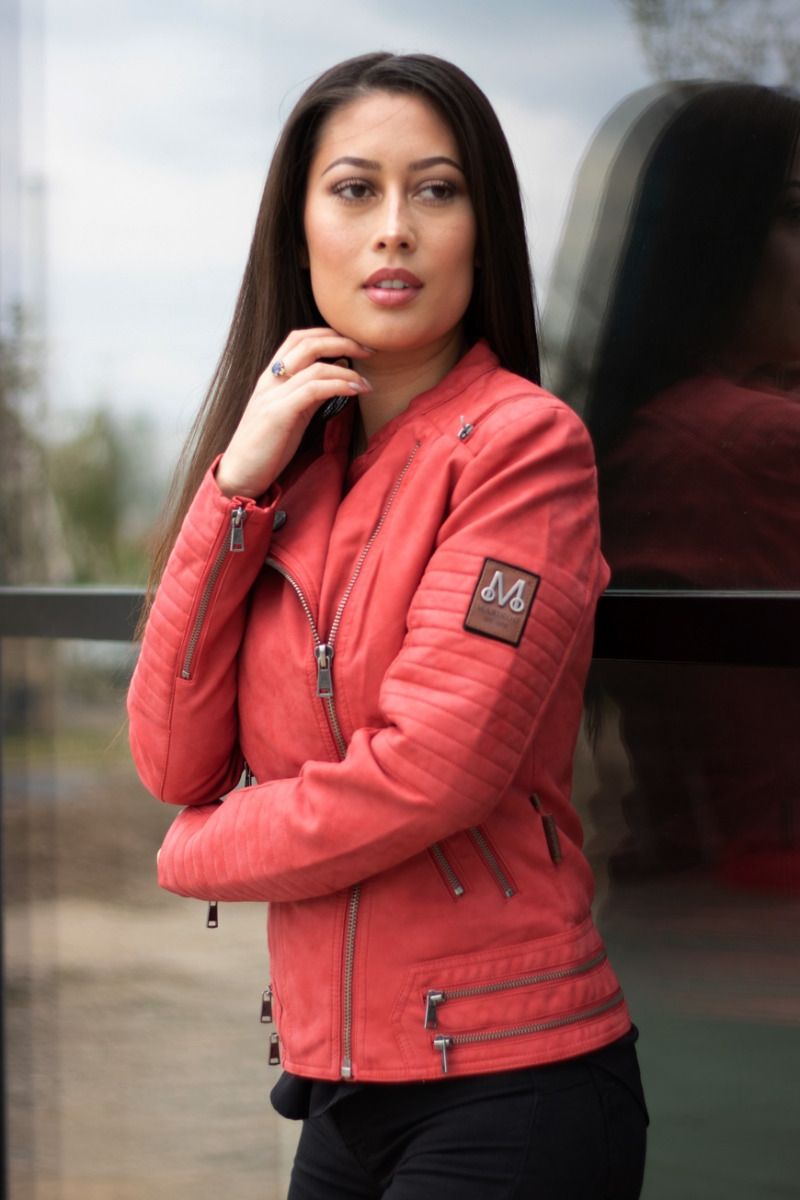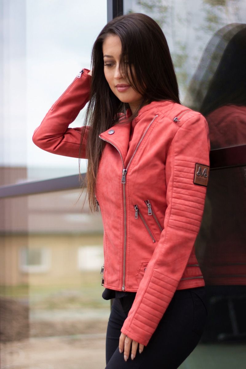 Flot og komfortabel kort læder look jakke i biker stil med lynlåse.