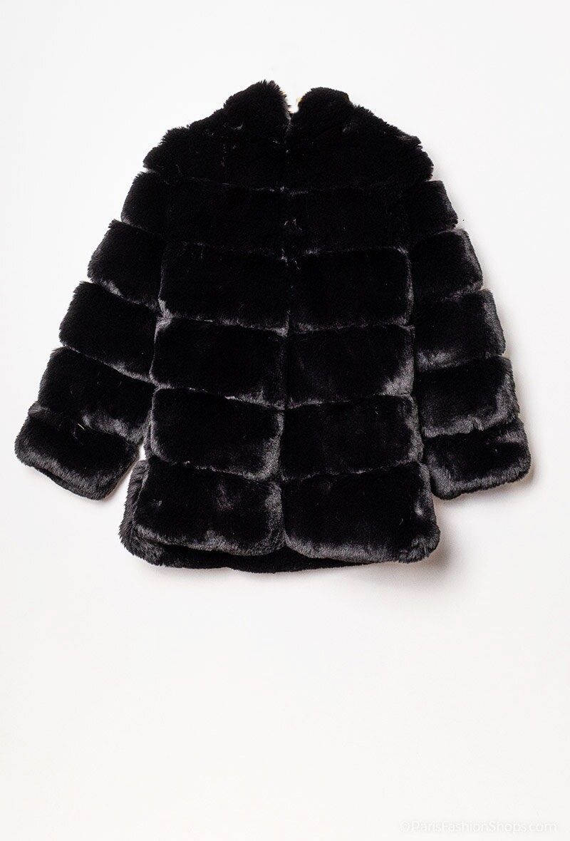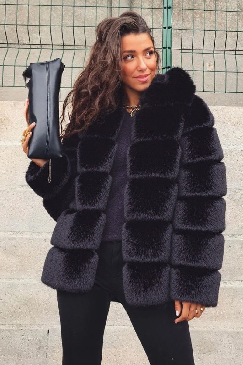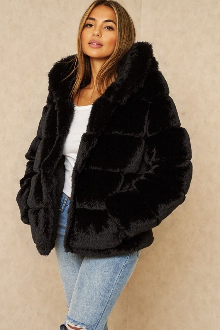Pels jakke i fake fur med hætte i sort